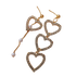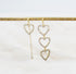 Asymmetric drop earrings featuring gold-tone heart outlines with pavé crystals and pearl-accented chain.