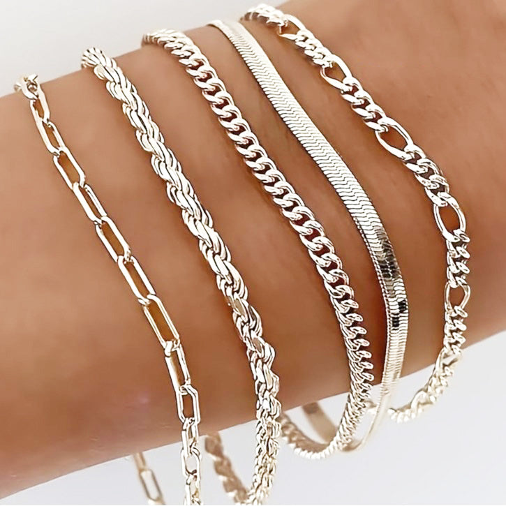 A bold and modern bracelet set featuring five distinct silver chain designs. Perfect for adding edge to your everyday style.