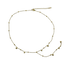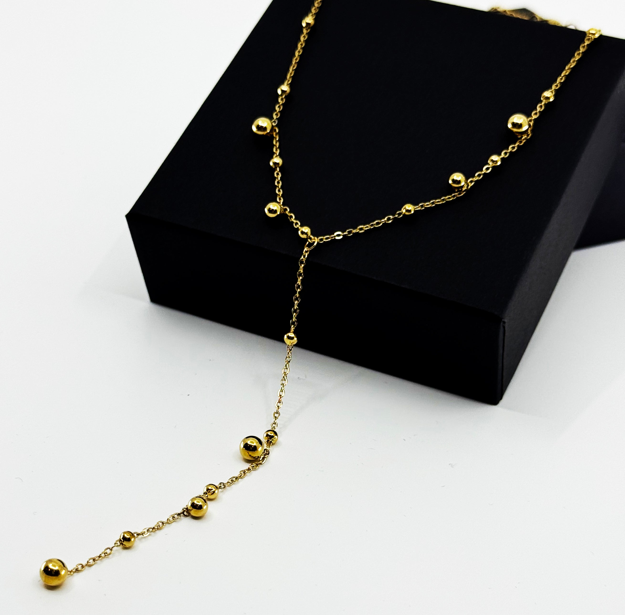 A stylish gold necklace featuring a chain with spaced gold beads in an elegant drop silhouette.