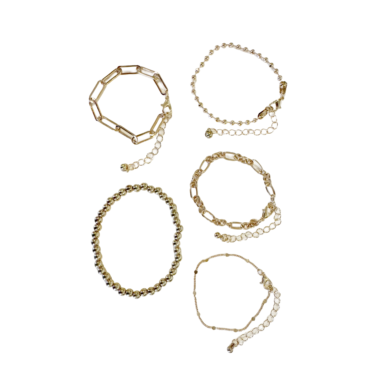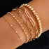 A five-piece gold bracelet set composed like a poetic rhythm. Perfect for stacking or highlighting each piece on its own.