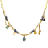 A gold-toned layered necklace adorned with pearls and charms, featuring a blue water drop gem as the focal point.