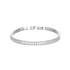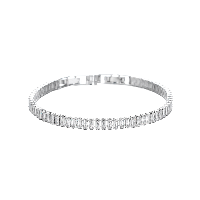 Platinum-tone tennis bracelet featuring sleek baguette-cut crystals in a crisp, modern finish.
